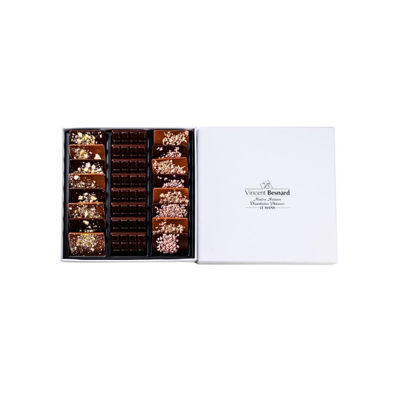 Ingrédients : chocolat de couverture au lait (sucre, beurre de cacao, poudre de lait entier, pâte de cacao, émulsifiant: lécithine de soja, arôme naturel de vanille ), chocolat blanc (beurre de cacao, sucre, lait entier en poudre, lait écrémé en poudre, lactosérum, beurre, émulsifiant : lécithine de soja, extrait naturel de vanille), chocolat noir (pâte de cacao origine Saint Domingue, sucre, beurre de cacao, émulsifiant : lécithine de soja, arôme naturel de vanille), chocolat noir (pâte de cacao, sucre, beurre de cacao, émulsifiant : lécithine de soja, arôme naturel de vanille), chocolat de couverture (pâte de cacao, sucre, beurre de cacao, émulsifiant: lécithine de soja, arôme naturel de vanille ), pépite de framboise (purée de framboise, sucre, pomme, dextrose, fibre d'ananas, gélifiant: alginate de sodium [E401], stabilisant: di-calcium phosphate [E341ii], colorants (anthocyane [E163], curcumine [E100]), arômes, correcteur d'acidité; acide citrique [E330]), pépites fraise (purée de fraise, sucre, pomme, fibres d'ananas, gélifiant: alginate de sodium [E401], stabilisant: di-calcium phosphate [E341ii], arômes, colorants: anthocyane [E163], curcumine [E100], correcteur d'acidité: acide citrique [E330]), amandes, noisettes, pistaches