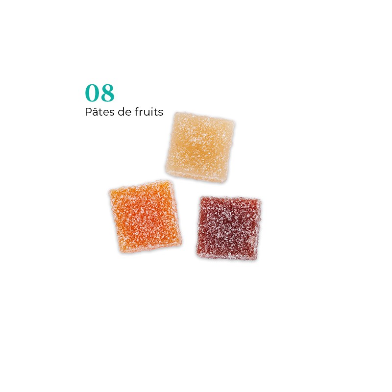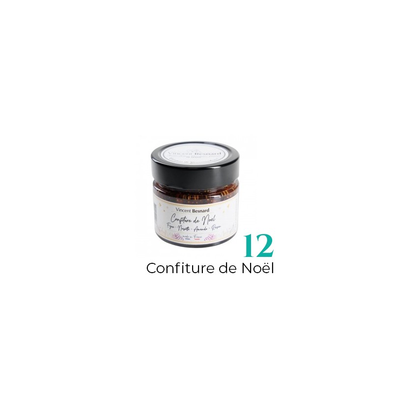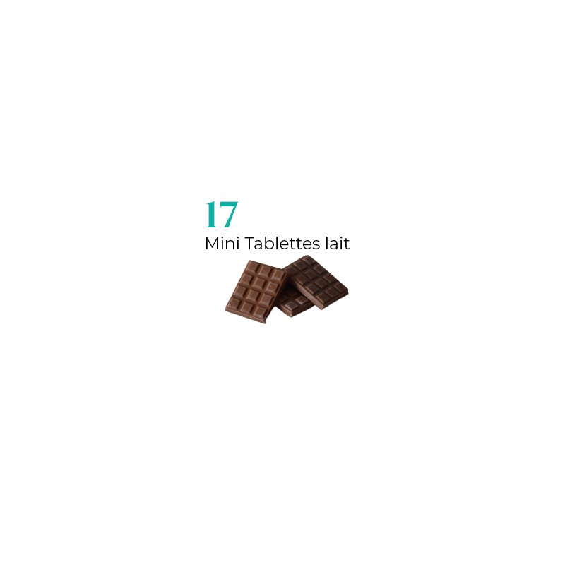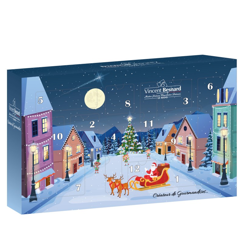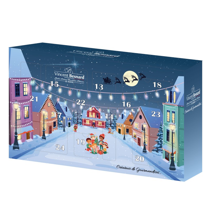 1/ Rose des sables : 50g 2/ Friture Lait : 25g 3/ Pâte à tartiner noisette : 100g 4/ Barre Chocolatée 5/ Nougat Amande - Caramel : 50g 6/ Sucette Sapin : 10g 7/ Maxi ourson noir : 40g 8/ Pâte de fruits : 25g 9/ Mini-tablette noir : 10g 10/ Pâte à tartiner caramel : 100g 11/ Barre Chocolatée : 50g 12/ Confiture de Noël : 100g 13/ Friture Noir : 25g 14/ Barre Chocolatée : 50g 15/ Pavés du Vieux Mans : 50g 16/ Caramel tendre : 25g 17/ Mini-tablette lait : 10g 18/ Nougat Amande - Pistache : 50g 19/ Confiture Pomme Tatin : 100g 20/ Maxi ourson lait : 40g 21/ Sucette Père Noël : 10g 22/ Barre Chocolatée : 50g 23/ Marmelade Orange – Pain d’épices : 100g 24/ Père Noël : 25g