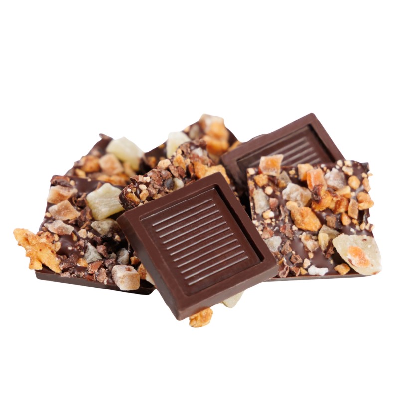 Ingrédients : chocolat noir (pâte de cacao, sucre, beurre de cacao, émulsifiant : lécithine de soja, arôme naturel de vanille), amandes, ananas, papaye, sucre, cacao en grains, eau, beurre, fleur de sel